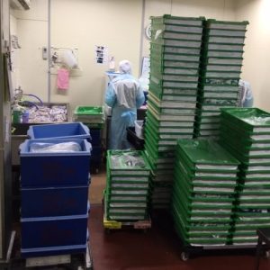 工程①では、開梱作業をしていますが、食品製造工場において、衛生的に開梱作業は本来別の部屋で行うべきですが、同じ部屋の中で行っていました。