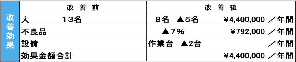 人員は3名削減、不良品は7%減、作業台も2台減らしました。これにより、年間で519万2千円の削減を実現しました。