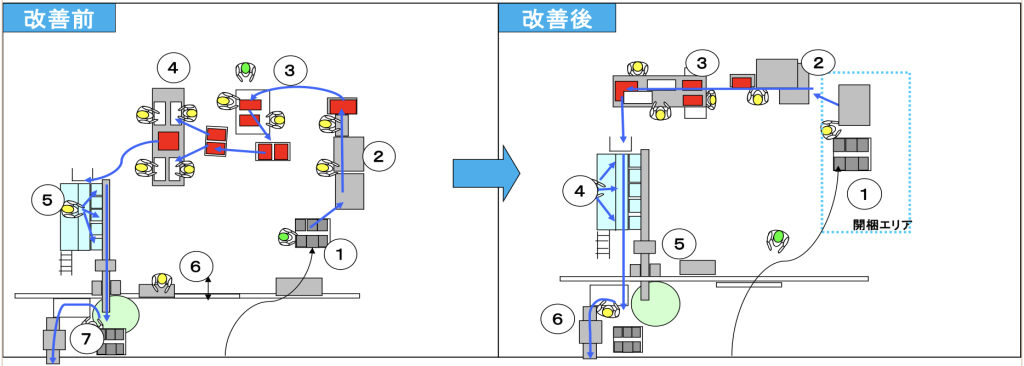改善後は、工程③と工程④の間が空いているがゆえに発生していた「動作・運搬のムダ」を排除するべく、作業台を近付ける「間締め」を行いました。工程④と工程⑤の間も空いていたので、近付けて「運搬のムダ」を減らしました。