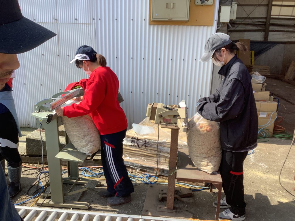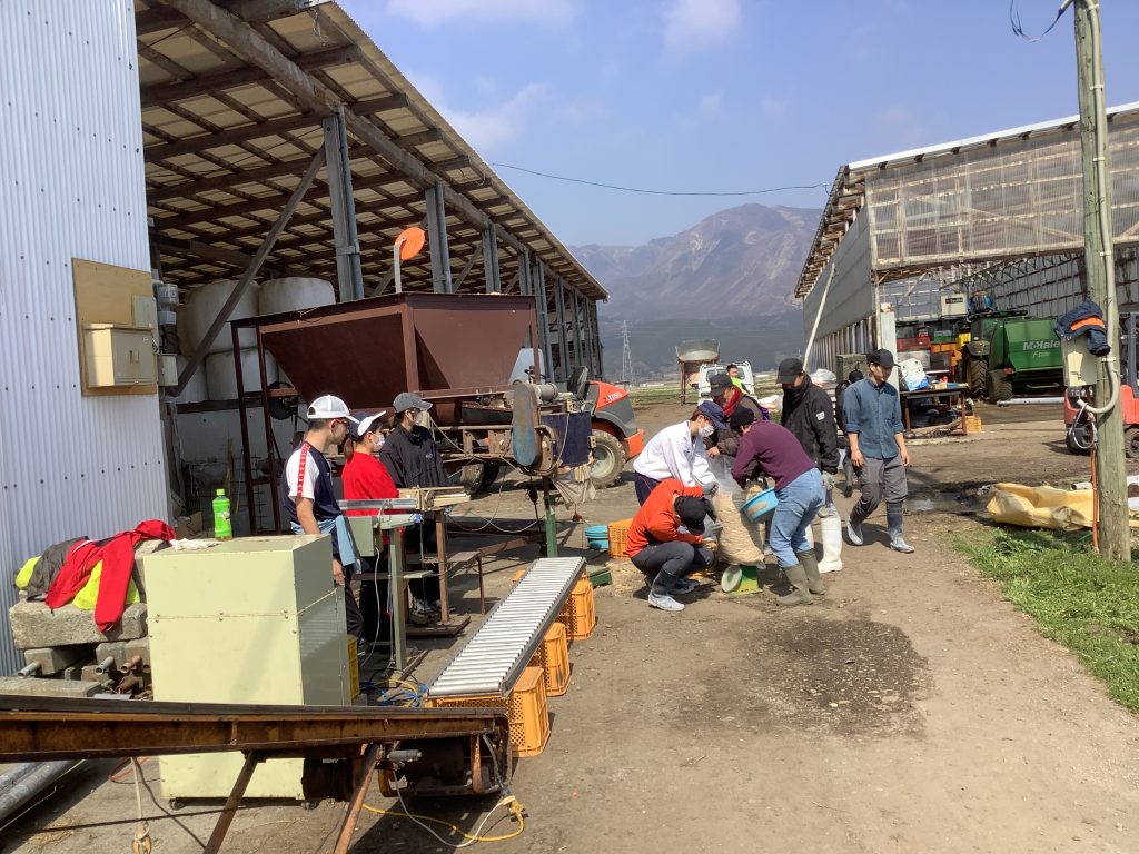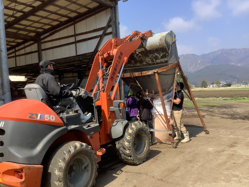 エコフィードの作成は、エコフィードの提供を受ける農家の人たちや、東海大学農学部の学生などが集まって、材料の搬入、飼料の混合、袋詰めといった作業をしています。袋詰めについては、利用者のニーズに合わせて、フレコン袋・20キロポリ袋・ドラム缶のバリエーションがあり、それぞれ計量・詰め込み作業を行なっています。